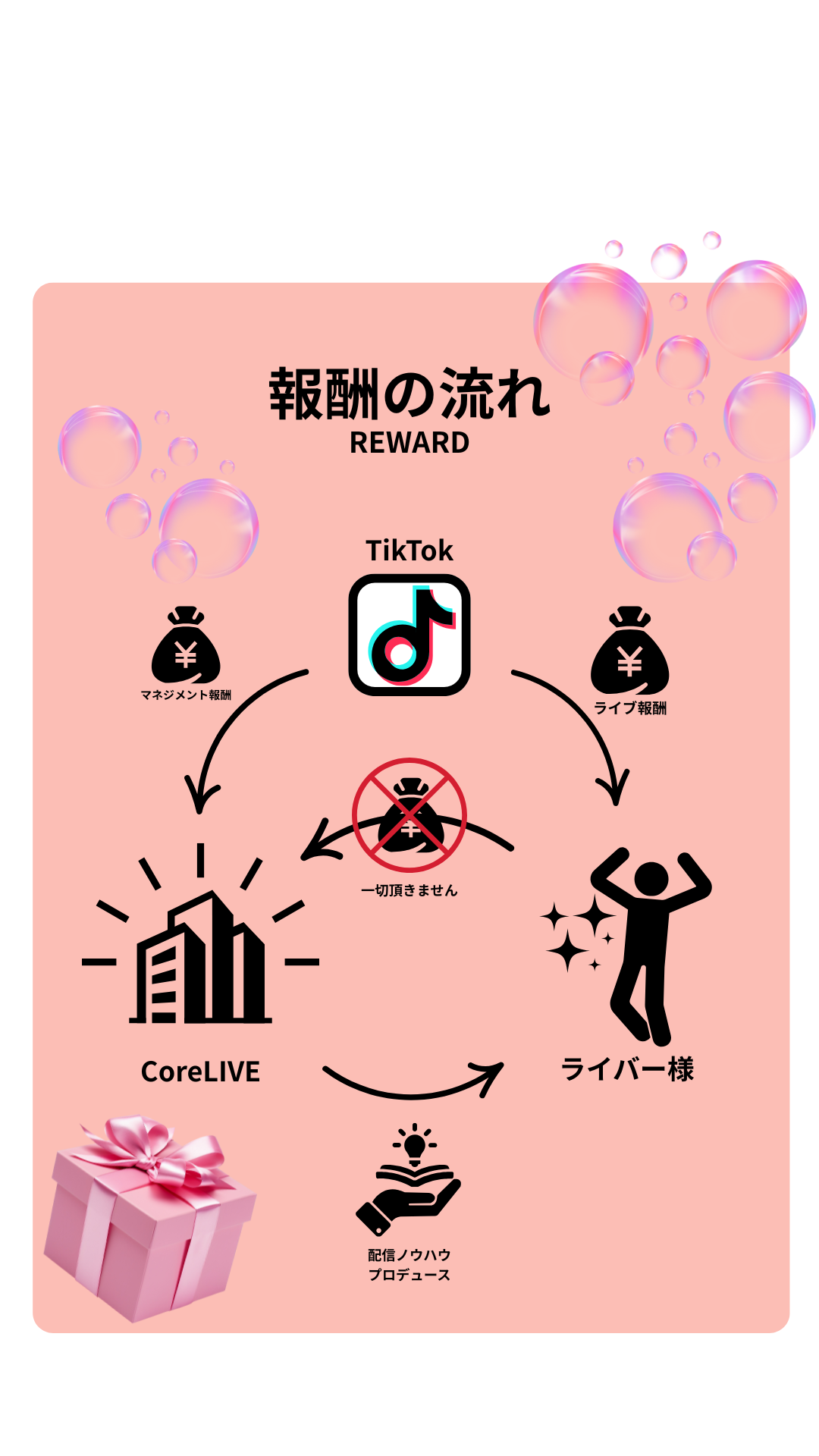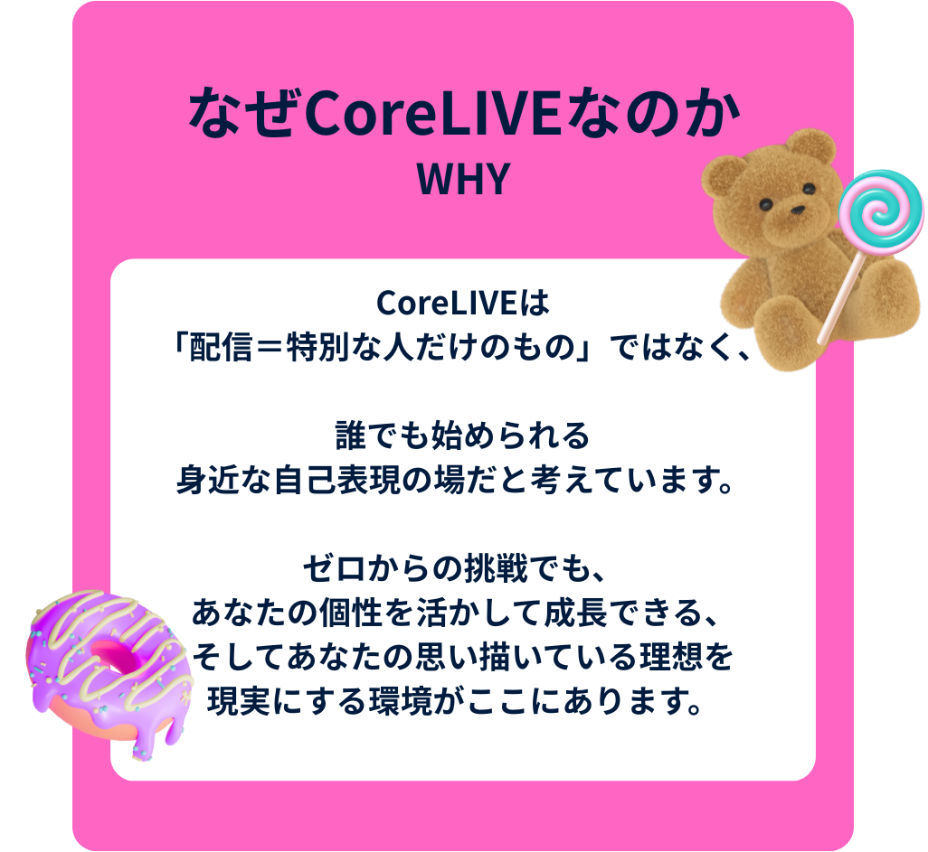 CoreLIVEは、TikTokLIVEなどのプラットフォームで活躍するライバーの育成・マネジメントを行う公式パートナー事務所です。